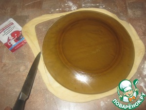 Раскатываем каждую часть и вырезаем из неё круг (я по размеру тарелки большой)