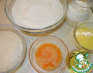 Яйцо размешать с солью. Муку просеять. Оставшееся молоко подогреть. Сливочное масло растопить и смешать с растительным. Муку насыпать горкой, в центре сделать углубление, вылить туда забродившие дрожжи, яйцо и молоко. Замесить тесто. Частями добавлять смесь масел и тщательно вымешивать до эластичности.