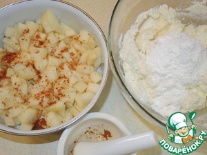 Рикотту смешать с сахарной пудрой. Специи добавить к порезанной груше.