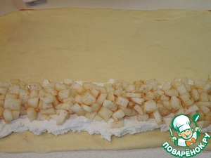 На длинный край теста выложить сначала рикотту, на неё груши.