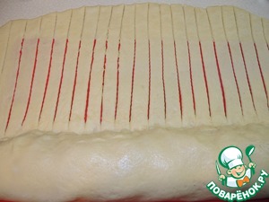 Завернуть начинку один раз. Оставшееся тесто порезать на тонкие полоски. Заврнуть начинку далее.