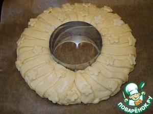 Свернуть получившейся рулет кругом, защипнуть края. На середину противня, застеленного пергаментом, поставить кулинарное кольцо, вокруг которого положить наш рулет. Накрыть полотенцем и оставить подходить на пол часа. Духовку разогреть до 180 градусов. Пирог смазать яйцом и выпекать 30-35 минут. Немного остудить и подавать.