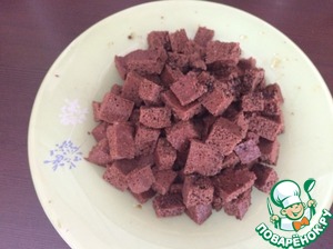 Остужаем коржик и нарезаем его на небольшие кубики, в свежесваренный кофе добавляем ароматизатор ваниль-ром и обмакиваем наши кубики.