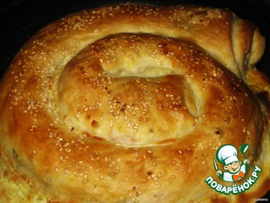 Через 7-10 минут после запекания, вынуть пирог, залить яичной смесью и посыпать кунжутом.
