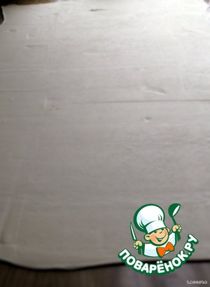 Тесто раскатать в длинный пласт толщиной 2-3 мм.