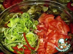 Помидоры нарезать небольшими кусочками, лук-порей - кольцами.