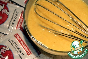 Для начала готовим опару для теста. В молоко комнатной температуры добавляем сухие быстродействующие дрожжи "Саф- Момент" 11 г (для усиления эффекта я использовала быстрорастворимые дрожжи в красной упаковке), 6 ст. л. сахара и 3 ст. л. пшеничной муки, перемешиваем, накрываем, укутывая полотенцем и ставим в теплое место для увеличения объема в 2 раза. -