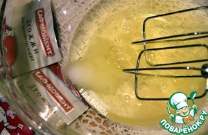 Отделяем желтки от белков. В желтки добавляем 1/2 стак. сахара, 1,5 г ванилина, 1/2 ч. л. кардамона, коньяк или домашнюю спиртовую настойку- 4 ст. л. (на молодых листьях черной смородины, черноплодной рябины, вишни и малины), растительное подсолнечное рафинированное масло- 3 ст. л. и 100 г измельченного мягкого сливочного масла (не растопленного, а именно мягкого!).