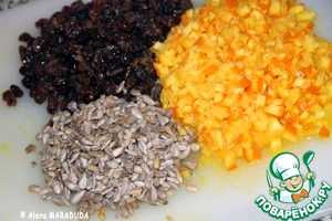 Моем и сущим очищенные подсолнечные семена- 1/3 стак., моем изюм- 3/4 стак. и высушиваем.