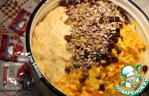 В поднявшееся тесто добавляем подготовленные добавки: апельсин, семечки подсолнуха и сухой изюм.