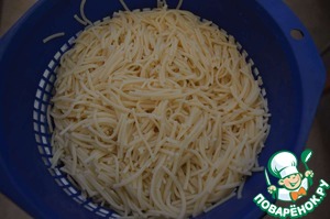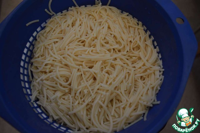 Лапшу выложить в кипящую подсолённую воду и варить до готовности. Откинуть на дуршлаг.