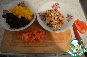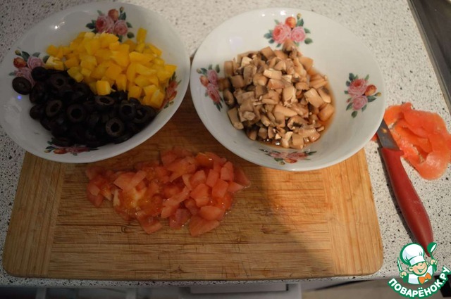 Помидоры очистить от кожицы и мелко нарезать. Вымытые грибы и перец, а также маслины измельчить.