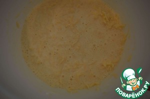 Яйца взбить венчиком в пену, смешать со сметаной и натёртым на мелкой тёрке сыром, добавив молотый перец и соль.