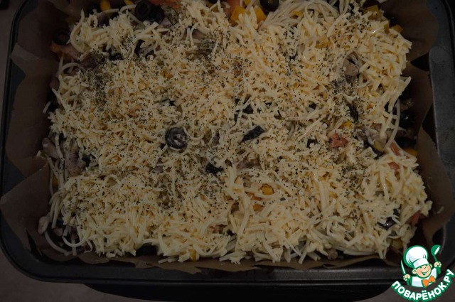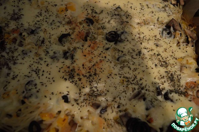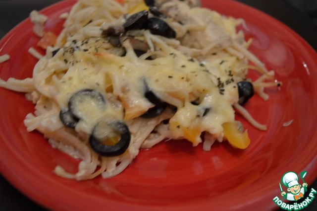 Рецепт «Запеканка из лапши с маслинами и грибами»: