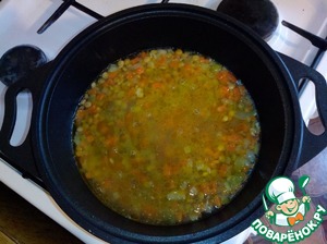 Варим под крышкой на медленном огне, пока чечевица не станет мягкой. От цвета зерен зависит время приготовления, красная чечевица будет готова через 30 минут, зеленая варится дольше. У меня была зеленая, была готова через 45 минут.