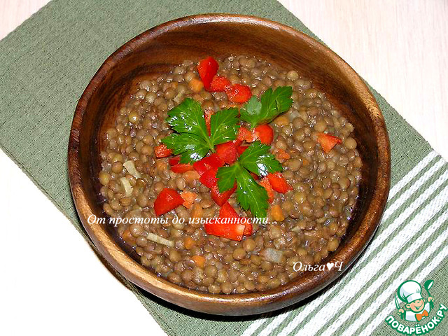 Нашла этот рецепт в журнале. Теперь готовлю постоянно это блюдо. За счет овощей чечевица очень сочная, не сухая. И за счет специй очень ароматная. В чечевице много белка и поэтому ей можно заменить мясо. Я использую как отдельное блюдо, а не гарнир. Но кто как хочет. Это мой первый выложенный здесь рецепт, не судите строго. Совпадение нашла одно, но там специи и методика приготовления другие.