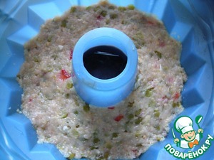 В форму для выпечки, смазанную маслом, ложкой выложить фарш с зелёным горохом и слегка утрамбовать