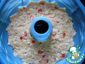 Полноценное диетическое блюдо, не требующее гарнира. Куриный фарш в сочетании с зелёным и жёлтым горохом, красным сладким перцем, уложен в форму-кольцо и запечён в духовке.