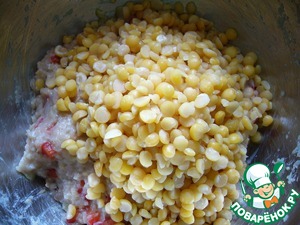 В другую половину-сваренный жёлтый горох и тоже перемешать