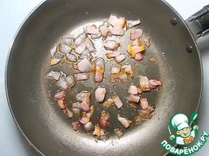 Мелко порежьте бекон и обжарьте его на сухой сковороде несколько минут, чтобы вытопился жир.