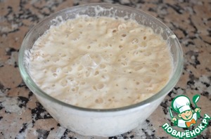 1. Для опары в миску насыпать дрожжи, около 100 г муки, добавить мед и теплую воду.