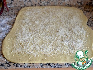 7. Присыпать рабочую поверхность мукой и переложить на нее тесто. Отрезать кусок теста размером с яйцо, завернуть его в пленку и отложить. Оставшееся тесто раскатать в прямоугольник толщиной 5 мм. Поверхность теста смазать смальцем, равномерно посыпать тертым сыром и черным перцем.
