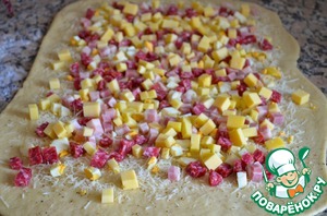 8. По всей поверхности теста разложить кусочки колбасы, бекона, сыра и яиц.
