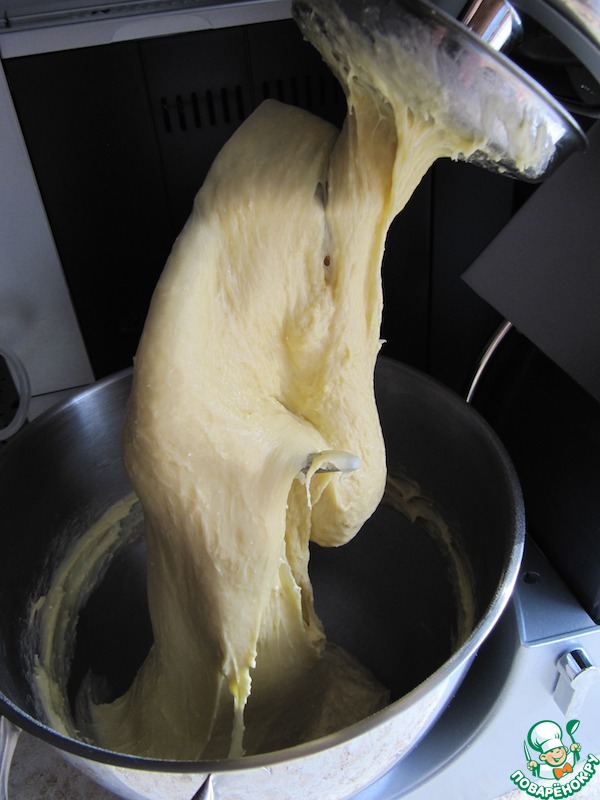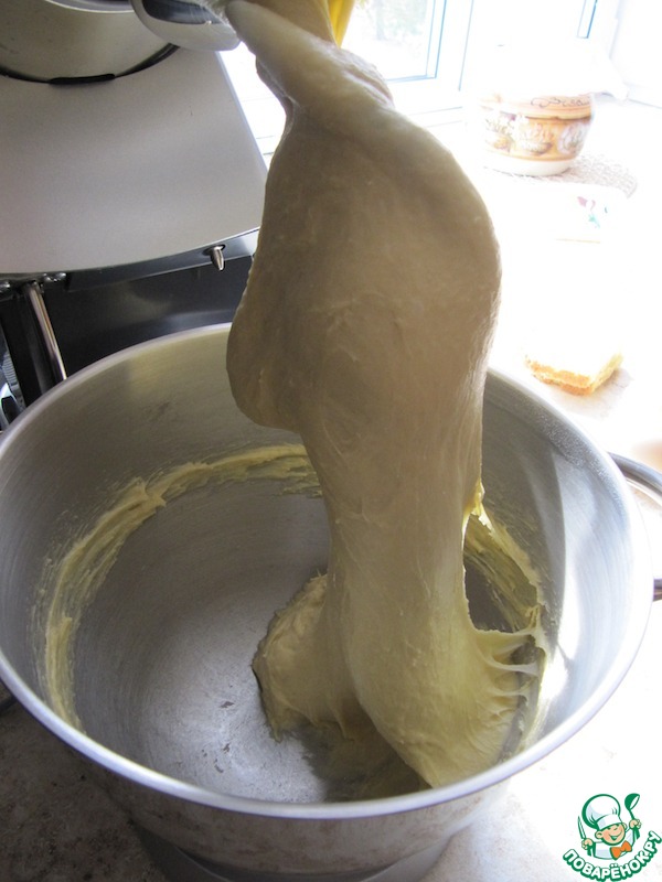 • Смешать все подготовленные ингредиенты и замесить тесто. Тесто я вымешивала стационарным миксером насадкой "крюк" сначала на низких оборотах, затем на средних около 10-15 минут. В процессе вымешивания я добавила сверх нормы несколько столовых ложек муки, так как тесто не собиралось вокруг насадки - было жидковато. Тесто получилось гладкое, но липкое и тягучее! Здесь важный момент - это тесто трудно вымесить руками, поэтому если нет стационарного миксера, то можно использовать ручной миксер с насадками для теста и вымешивать указанное время! Если использовать ХП для замеса, то всю порцию нужно разделить на 2 части. Если у ХП лопасти короткие, то нужно силиконовой лопаткой помогать при вымешивании, должен сформироваться колобок (не тугой!). Возможно добавление муки, но тесто забивать мукой не нужно!