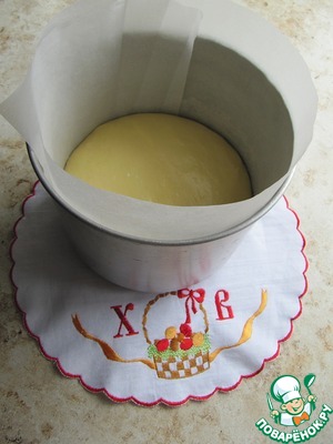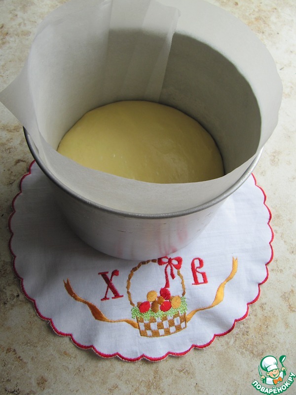 • Дно и бока формы застелить бумагой для выпечки, заполнить на 1/3 и поставить на расстойку.