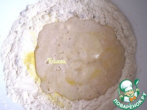 Добавим дрожжевую смесь, слегка взбитые яйца и мягкое сливочное масло.