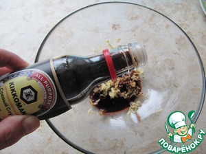 Чеснок продавить через пресс, залить соевым соусом по вкусу.