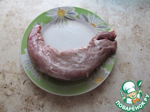 Поперек куриного филе положить замаринованную филейную часть свинины.