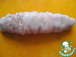 Мед смешать с соевым соусом ТМ Кикоман, подогреть до растворения меда. За 15 минут до готовности снять с рулета нити, смазать медово-соевым маринадом и продолжить запекание, через 5-10 минут еще раз смазать рулет и продолжить запекание!