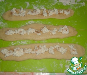 Раскладываем творог по полосочкам и посыпаем корицей. Корицы насыпаем по своему вкусу.