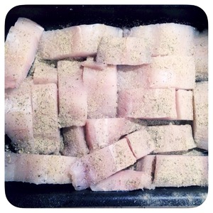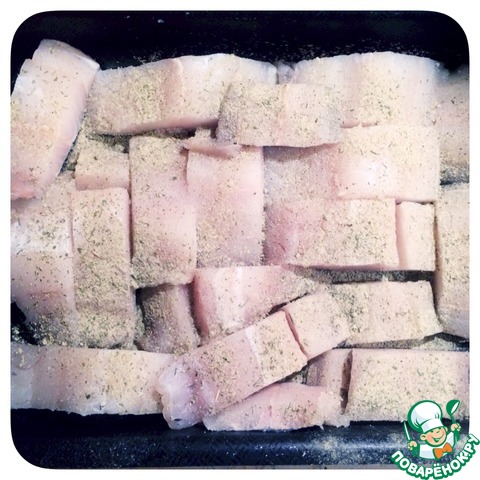 Рыбу режем порционными кусочками, укладываем в форму для запекания и посыпаем приправой для рыбы.