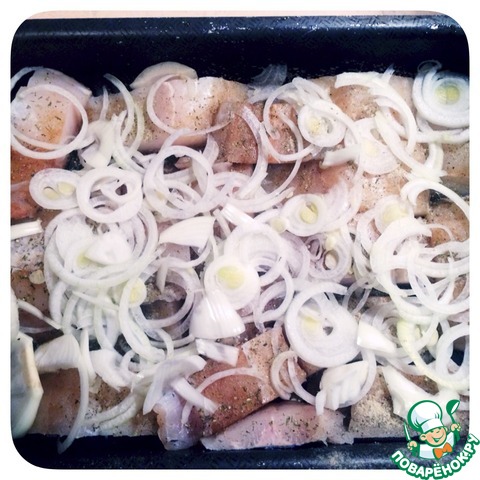 На рыбу выкладываем лук, порезанный колечками. Чуть соли сверху лука, но это не обязательно.