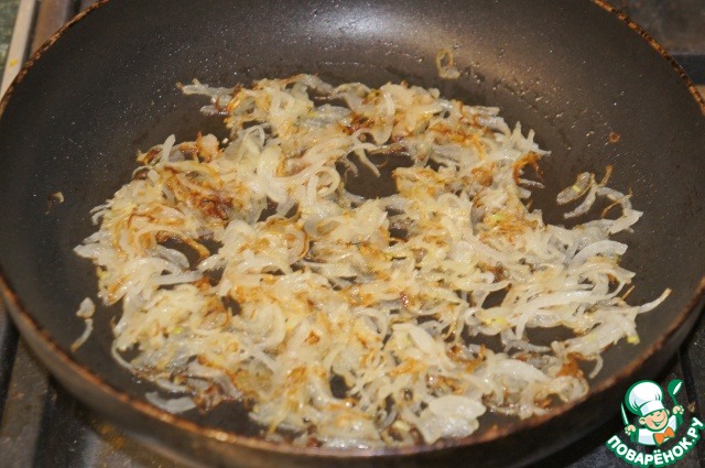 В глубоком сотейнике разогреть 3 ст. л. масла и обжарить лук до золотистого цвета.
