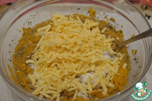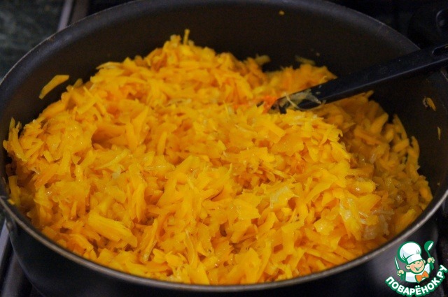 Натереть тыкву на крупной терке. Положить в дуршлаг, застеленный марлей, присолить, перемешать и оставить, чтобы стекла жидкость, приблизительно на 15 минут. Затем выжать тыкву, пока не выйдет вся жидкость и не останется плотная масса.