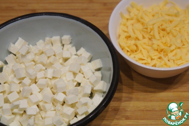 Пока тыква тушится, подготовить сыры. Твердый сыр натереть на крупной терке, фету нарезать на маленькие кубики.