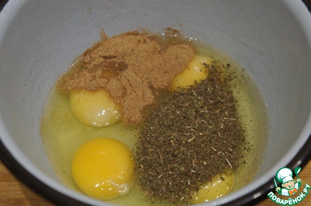 Яйца взбить с мятой и мускатным орехом.