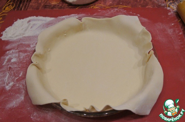 Тесто разрезать на две части, одна из которых должна быть немного больше. Форму d 26 см слегка смазать маслом. большую часть теста раскатать в круг так, чтобы можно было выстелить форму и края немного свешивались, чуть-чуть, примерно на 1 см.