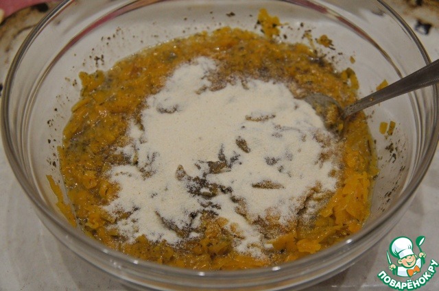 В немного остывшую тыквенную начинку добавить яичную смесь и манку.