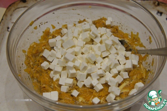 Затем осторожно и аккуратно вмешать фету, чтобы не помять кубики. Солить не надо, так как тыква уже была присолена и соленые сыры обеспечат необходимое количество соли.