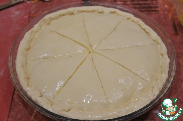 Раскатать вторую часть теста в круг, равный размеру формы и накрыть начинку. Излишки нижнего коржа отрезать, края загнуть на пирог и тщательно защипать. Смазать поверхность молоком или желтком, взбитым с 1 ч. л. воды. Надрезать верх пирога на сектора (только тесто).