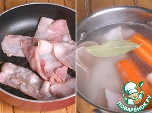 Весь секрет в приготовлении этого салата состоит в том, что отваривать его ингредиенты мы будем в ароматном бульоне. Лучше всего использовать для этого кусочек сырокопченой грудинки, а я заменила его варено-копченым беконом, предварительно немного обжарив.