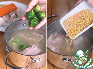 Когда курица свраится, достаем ее вместе с овощами, кидаем капусту, предварительно разморозив. Отвариваем 5 минут, откидываем на дуршлак, а в бульон засыпаем чечевиу и варим 8-10 минут.