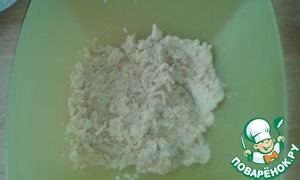 Добавить дрожжи и постепенно всыпать оба вида муки, замесить мягкое тесто. Оставить подходить тесто на 1 час