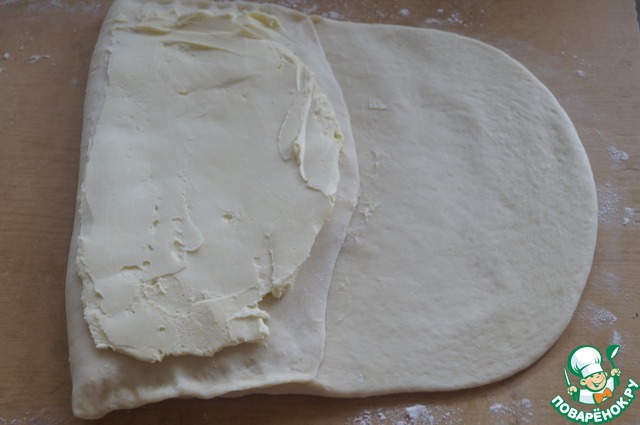 Тесто достать из холодильника и раскатать на припудренной мукой поверхности в пласт размером 23*46 см. Одну половину масляного блока положить в центр теста, накрыть левым краем теста, положить поверх вторую половину масла.