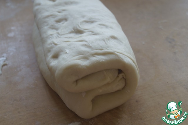 Раскатать охлажденное тесто в прямоугольник 20*45 см. Сложить в 4 слоя: сначала от краев к центру, затем одну половину на другую. Снова завернуть в пленку и убрать в холод на 20 минут.