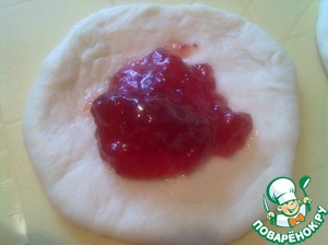 Каждый кусочек теста раскатайте в тонкий пласт. На самый маленький кружочек теста на серединку кладем 1 чайную ложку клубничного джема, хорошо защипываем тесто и формируем шарик.